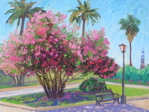 I know this looks like a crape myrtle (for you that live in the south), but this is an oleander tree. They grow everywhere in Sevilla, Spain. Even bougainvillea are trained into trees. This was in a large and beautiful park in the center of the city. Everything was blooming when we were there in May 2016. You can one of the many cathedrals in the distance.