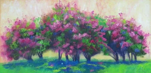 This grove of crepe myrtles is gorgeous twice a year when it is in full bloom. It is surrounded by buildings and can get lost in the scene as you drive by. However, I just erase them in my mind as I have done here in the painting. This canvas is a unusual, horizontal shape and would look interesting on your wall.