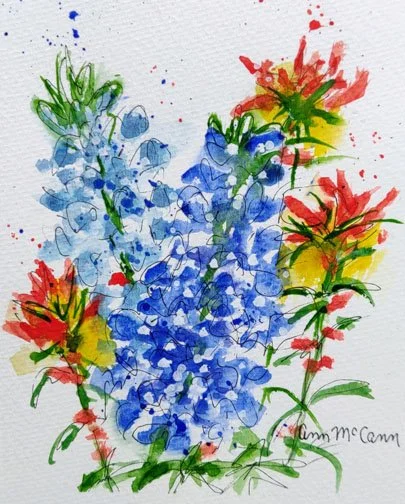 Bluebonnets & Indian Paintbrush by Ann McCann 5 X 7" Watercolors March 16, 2026 I’m feeling the need to create many small paintings with all the flower options in the spring.