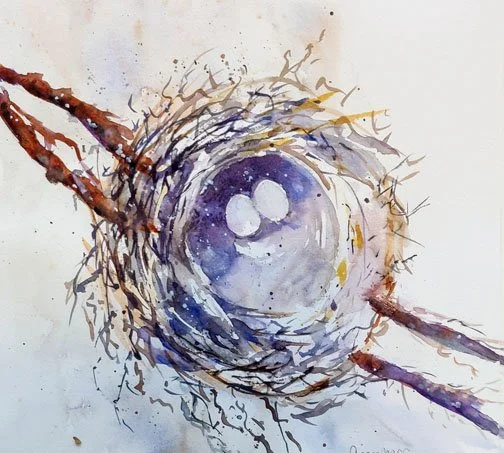 This is a robin’s nest with pale blue eggs but it contains a galaxy with moons and stars in the center.